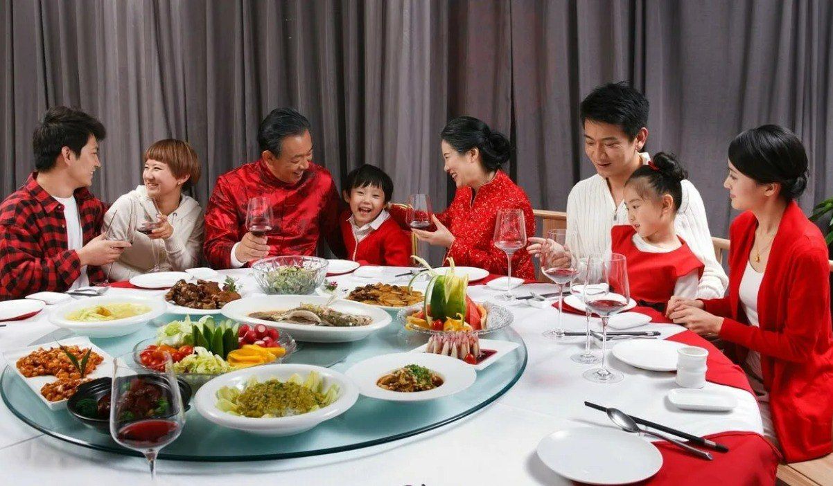Ночь под китайский Новый год называют также "ночью встречи после разлуки". Для китайцев это самый важный момент. Вся семья собирается за праздничным столом к новогоднему ужину, который отличается не только обилием и разнообразием блюд, но и многочисленными традициями. Например, новогодний ужин не обходится без блюд из куриного мяса, рыбы и "доуфу" — соевого творога, называемого в России "тофу", потому что в китайском языке названия этих продуктов созвучны со словами, означающими "счастье" и "достаток".