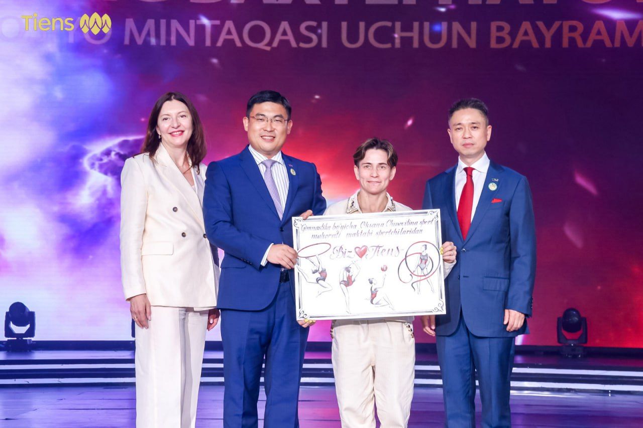 Амбассадором TIENS в Узбекистане на протяжении нескольких лет является легендарная гимнастка и основательница собственной спортивной Академии Оксана Чусовитина. Оксана обратилась к участникам конференции с приветствием, а ее очаровательные воспитанницы – будущие чемпионки – продемонстрировали гостям свой талант и мастерство. Юные гимнастки вместе с Оксаной преподнесли председателю совета директоров господину Ли Цзиньюаню памятный плакат со словами благодарности за активную поддержку Академии. Подарок направлен в музей TIENS в Китае.